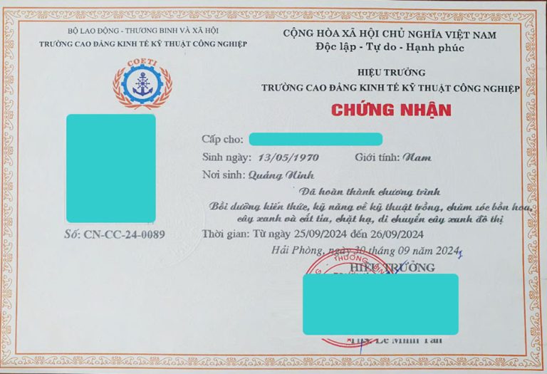 Văn bằng chứng chỉ sau khi tham gia khoá học đào tạo trồng và chăm sóc cây xanh
