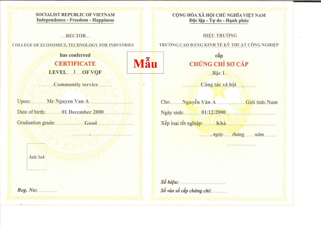 – Chứng chỉ do trường Cao Đẳng Kinh Tế Kỹ Thuật Công Nghiệp Cấp